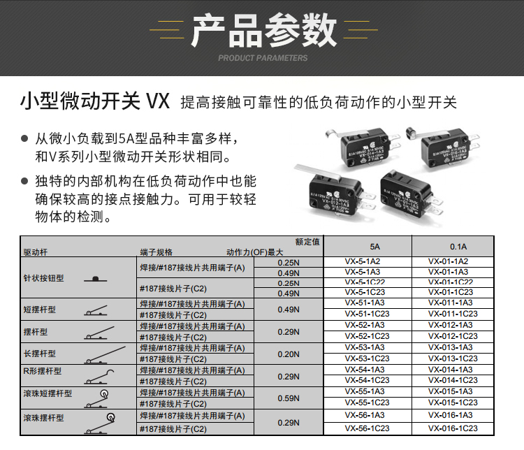 | 驱动杆 | 摆杆型 | 额定规格 | 0.59N | 端子 | 焊接#187接线片共用端子 |